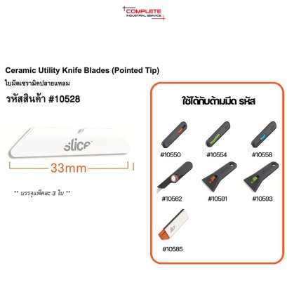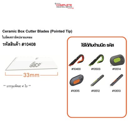 ด้ามมีดผลิตจากพลาสติก ABS อย่างดีและเนื้อยางนุ่มบริเวณมือจับ ออกแบบด้ามจับโค้งมน เพื่อป้องกันสันมือจากการกระแทก ใบมีดดึงกลับเองอัตโนมัติเมื่อไม่ได้ใช้งาน เพื่อป้องกันอันตราย ใช้ร่วมกับใบมีดเซรามิคแบบ 2 คมตัด (รหัส 10404, 10408)
