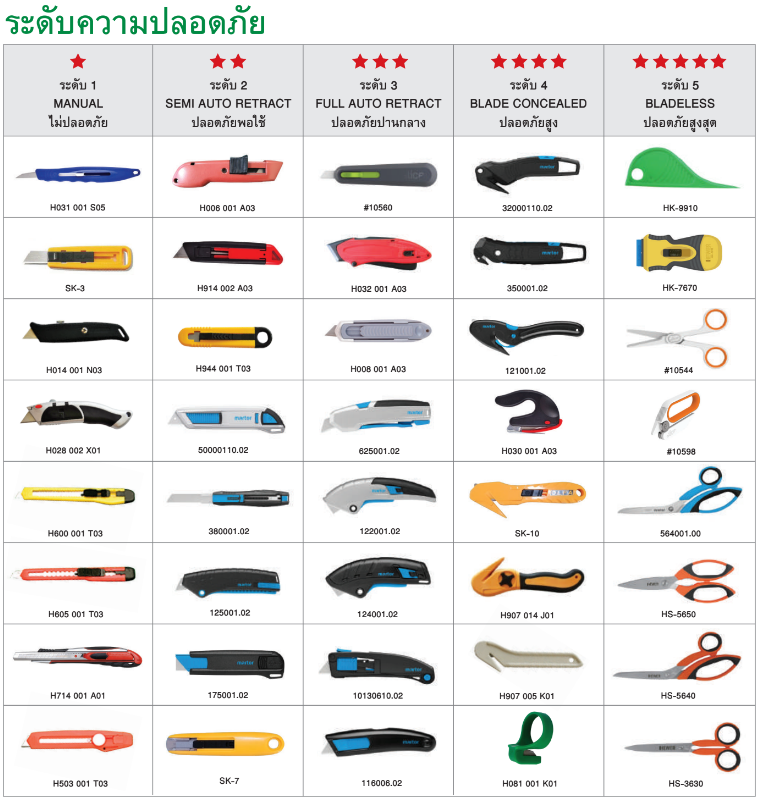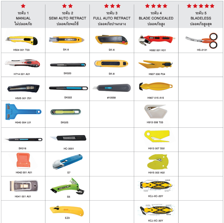 ระดับความปลอดภัยของมีดเซฟตี้ เราแบ่งออกเป็น 5 ระดับ